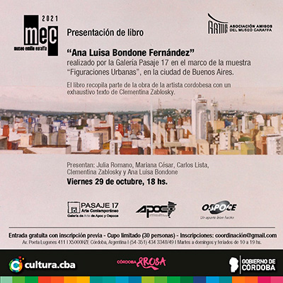 Presentación del Libro de Ana Luisa Bondone en el marco de la muestra “Figuraciones Urbanas” de la Galería de Arte Contemporáneo PASAJE 17, CABA. ISBN 978-987-46427-8-3. Curadora Clementina Zablosky.