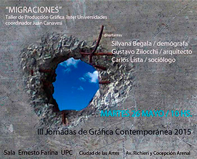 Panel junto a la demógrafa Silvana Begala y el arquitecto Gustavo Zilocchi, III Jornadas de Gráfica Contemporánea, Discurso y procesos creativos de la gráfica contemporánea. Migraciones, taller de producción y capacitación Inter Universidades. Sala Farina, Facultad de Arte y Diseño, Universidad Provincial de Córdoba, 26 de mayo de 2015